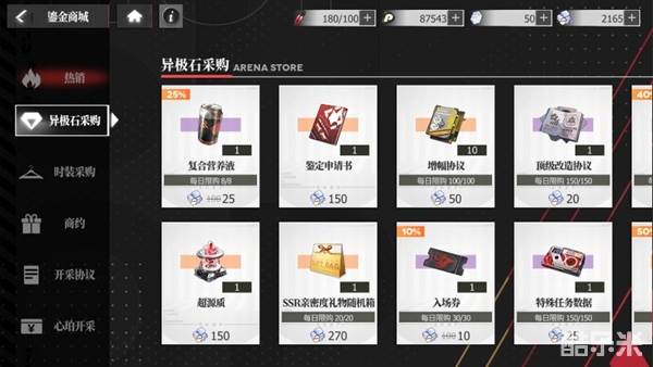 点击主界面>“热销”>“异极石采购”即可进入异极石采购界面。在这里可以使用异极石购买物品,部分物品每日有购买限制。这里优先推荐购买可以恢复行动点的复合营养液。