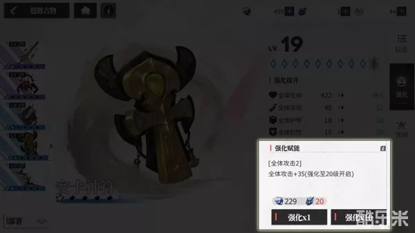 3、因为每次升级需要的材料都逐级增加,这使得我们为了强度与属性,需要平均的强化每一个古物。在古物每提升10级后,还会为全队增加额外的属性,所以不要忘记升级哦。