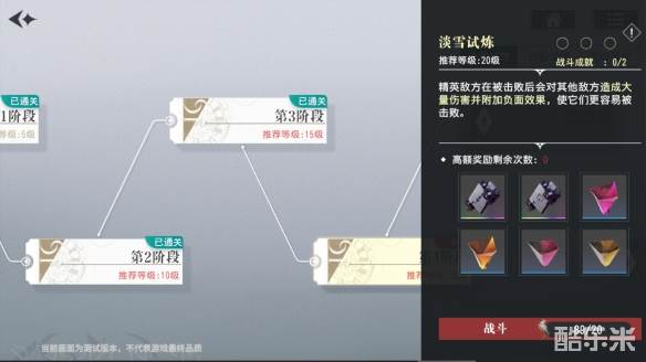 在反复进行主线故事及模拟作战后,当指挥家四名上阵角色乐谱都达到了三阶,可以进入委托作战阶段,在前期推荐刷[千景境界]副本中的[淡雪试炼],获得“律刃”及“阵守”资源,将队伍的输出及防御提高上去。对于委托作战,简而言之就是尽早往最高处打,特别是打到[华彩乐段],可以获得宝贵的乐装,为奏者提供更多的属性加持。