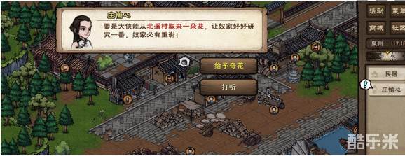 2、与旁边的NPC庄愉心进行对话,获取有关奇花异草的消息,以及一张纸条。