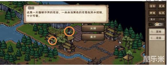 4、继续与庄愉心对话,然后前往(15,3)进行采摘,再去附近寻找黄色小花。