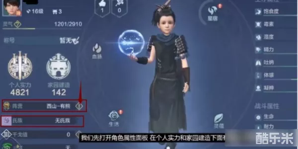 2、接着我们打开游戏角色面板,在个人实力和家园建造下面有阵营一栏,会出现感叹号点击;如下图所示;