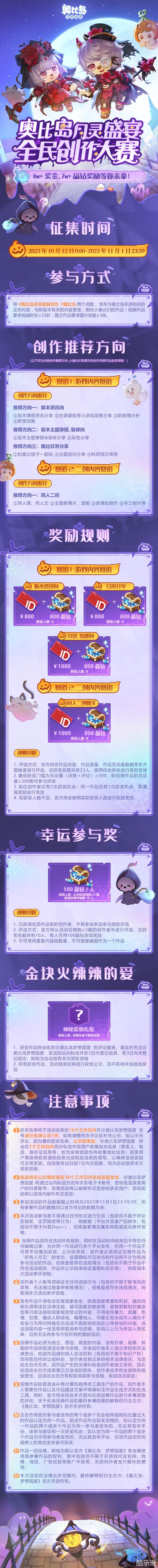 本次「奥比岛月灵盛宴」全民创作大赛将在微博、小红书、抖音、B站四个平台同步开启,征集时间为2023年10月12日 0:00 至 2023年11月1日 23:59,详细规则请戳下方长图。