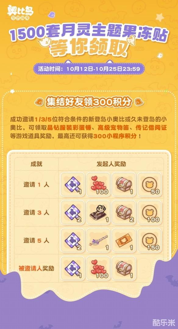 10月12日-10月25日23:59,前往「奥比岛福利站」微信小程序,点击首页活动海报即可参与活动。活动期间,小奥比们可邀请新登岛的小奥比或久未登岛的小奥比参加“月灵盛宴”版本活动,每邀请1/3/5位小奥比时,可领取「晶钻服装彩蛋锤、高级宠物笛、传记借阅证」等重磅奖励,最高还可领取300小程序积分。