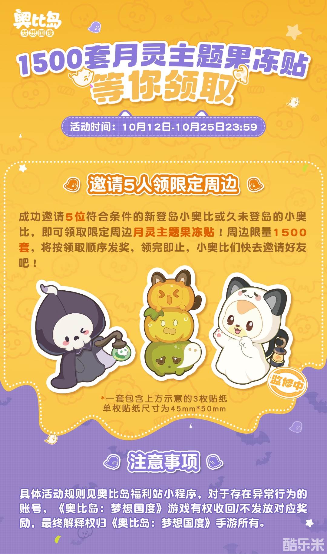 小奥比成功邀请5位符合条件的好友时,还可领取「月灵主题果冻贴」,周边限量1500套,将按领取顺序发奖,领完即止哦,小奥比们快分享给好友一起参与吧。接受其他好友邀请的小奥比也可获得「晶钻服装彩蛋锤、爱心、日常礼盒」奖励,快去加入其他小奥比的队伍吧!