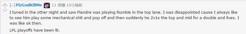 之前有一天我在看Snake的比赛,Flandre拿了上单兰博,当时我有点失望,我希望他拿出能秀的英雄然后跟人打架。但是突然间他就用兰博1v2了对方的上单和中单,拿了双杀并活了下来。当时我觉得这还不错。