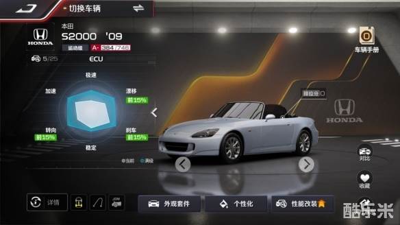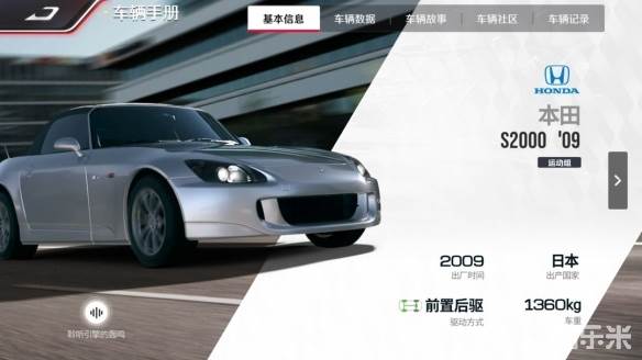 本田S2000 ’09在《巅峰极速》中属于【运动组】的赛车。在六大属性中,【转向】【漂移】【刹车】表现都很突出,排名都在前列。