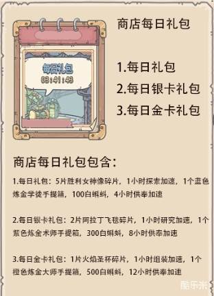 5片胜利女神像碎片、1小时探索加速、1个蓝色炼金学徒手提箱、100白蝌蚪、4小时供奉加速。