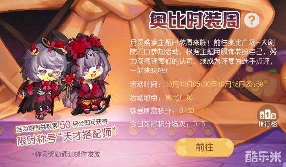 第十五期奥比时装周——月灵盛宴版本特别来袭!活动期间总共累计50积分,即获得限时称号「天才搭配师」。每轮比赛你将会随机分配得“评委”或“选手”角色牌。搭配主题装扮,努力获得评委们的认可,或成为评委为心仪的选手进行时尚点评吧。通过结算分享功能,小奥比们还可以将当场的参赛搭配分享出去哦,参与时装周比赛,争当最潮流的奥比!