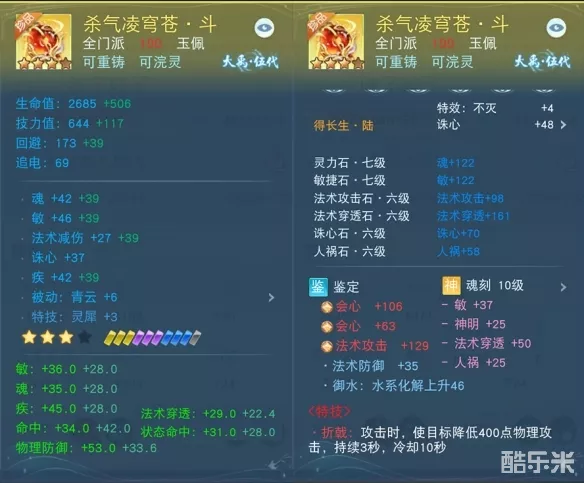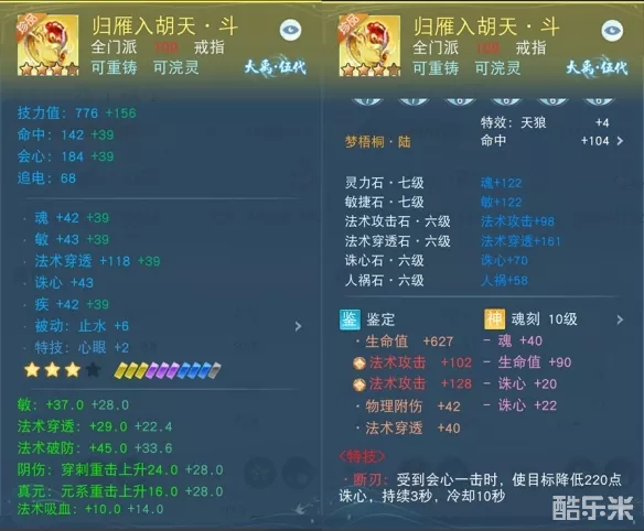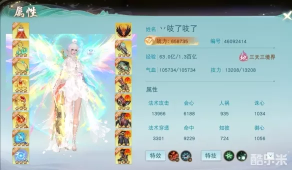 目前我的总战力是658735点,法术穿透和法术破防是我现在主要培养的方向,目前已经堆了3301点法术穿透与2265点法术破防,在打架时候能轻松破除对手的防御。法攻、命中和会心也比较优秀,帮我奠定了不错的输出基础能力,在团战中打出更可观地伤害;老牌四维人祸、诛心、御心、知彼,让我的攻击力又上一层新台阶的同时,也搭起牢固的防线,让我能更从容地面对对手的突袭。