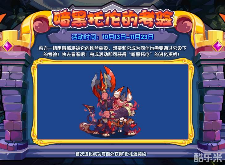 前方一切阻碍都将被它的铁斧摧毁,想要和它成为同伴也需要通过它设下的考验!快去看看吧!完成活动即可获得“暗黑托伦”的进化资格!