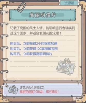 3、购买明信片之后,我们能立即获得2小时的探索加速和100的高丽藏宝图。