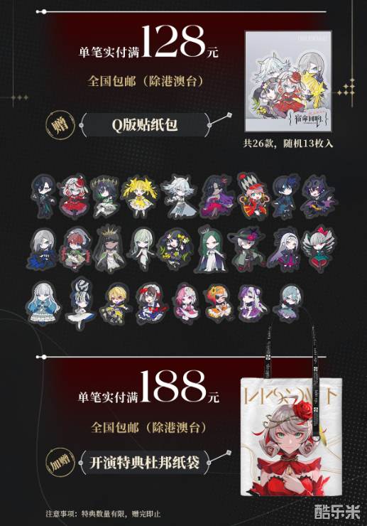 此外,本次上新也推出了重磅福利。10月18日到11月8日,单笔实付满128元,全国包邮的同时更送望月老师绘制的【Q版贴纸包】,单笔实付满188元,加赠【开演特典杜邦纸袋】,数量有限,先到先得,抓紧时间下单吧!