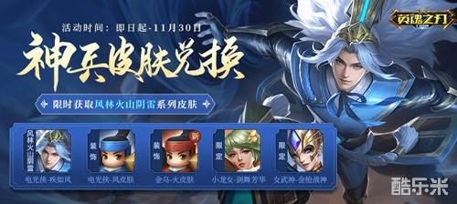 10月20日至11月30日,神兵皮肤兑换奖池更新,可限时获取侵掠如火专属战斗侍从、小龙女-剑舞芳华等好礼。同期,风林火山阴雷挑战【火】章节开启,【金乌-侵掠如火】专属战斗侍从也可以从本章节挑战中免费获取!