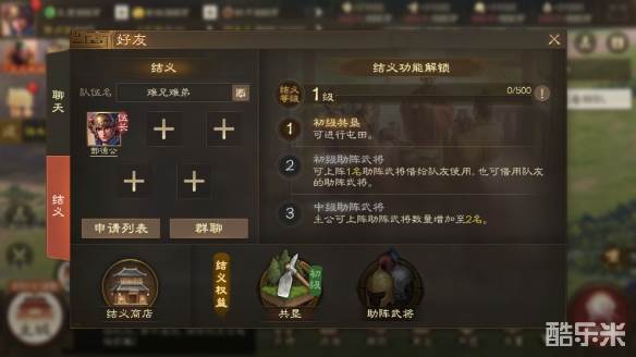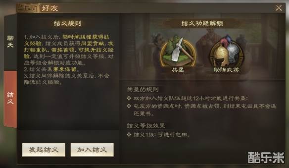 结义后,主公们可以通过活跃行为 (击杀蛮族首领、获得同盟贡献) 提升结义等级,不同等级即可开启不同的结义功能及效果,目前已有助力发育的“共垦”功能,以及共享武将资源的“助阵武将”功能。