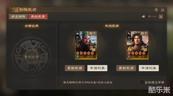 结义等级达到2级后,即可开启“助阵武将”功能,主公可以出借或借用武将,助阵武将等级、战法等级跟随被助阵者选择助阵的武将。