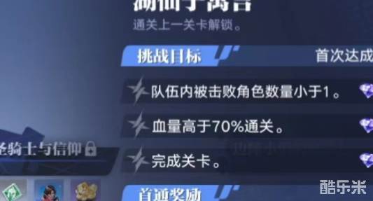 第1关湖仙子预言,要称过暗心大法师狂暴攻击,血量不能低于70%,只有血量要求没有输出要求,所以只要注意规避好伤害就能过。第2关誓约胜利之剑,成功到达终点,被击败数量不能大于一,过程中会有三个核心机关需要打破,注意好时间。第3关圣骑士与信仰,在倒计时结束之前通过暗心森林,不要被各种干扰所影响,争取在1120秒之前过去。第4关边陲小站的骚动,要摆脱大龙追击血量要高于40%,及时将障碍物清理开才能不被追上。