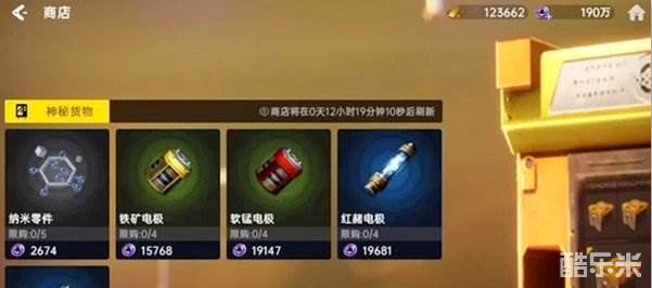 矿区商店中正在贩售5种货物,分别为铁矿电极(0/4)、软锰电极(0/4)、红赭电极(0/4)、黏土电极(0/4)、纳米零件(0/5),这些在今后的游戏中都会被用到,可用联盟币购买,括号中是每天的限购数量,小编建议大家囤一些。