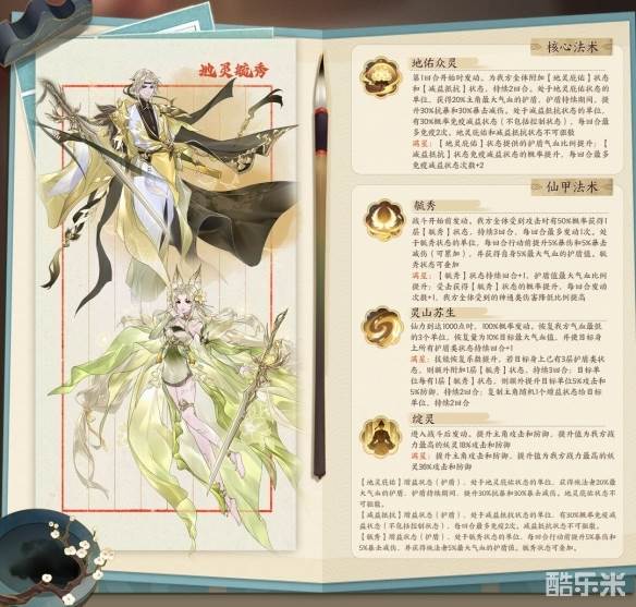 地佑众灵(升至1星解锁):为我方全体附加【地灵庇佑】状态和【减益抵抗】状态,持续2回合。处于地灵庇佑状态的单位,获得20%主角最大气血的护盾,护盾持续期间,提升30%抗暴和30%暴击减伤。处于减益抵抗状态的单位,有30%概率免疫减益状态(不包括控制状态),每回合最多免疫2次。地灵庇佑和减益抵抗状态不可驱散。