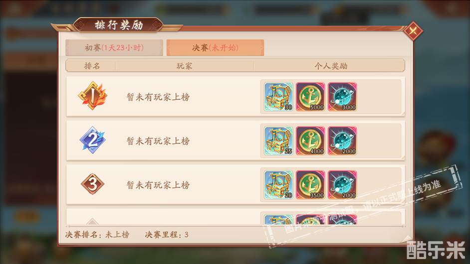 排行榜分为初赛排行和决赛排行,初赛排行在第2天24点结束,决赛排行在第3天24点结束,有意争夺排名奖励的少年请注意活动时间。