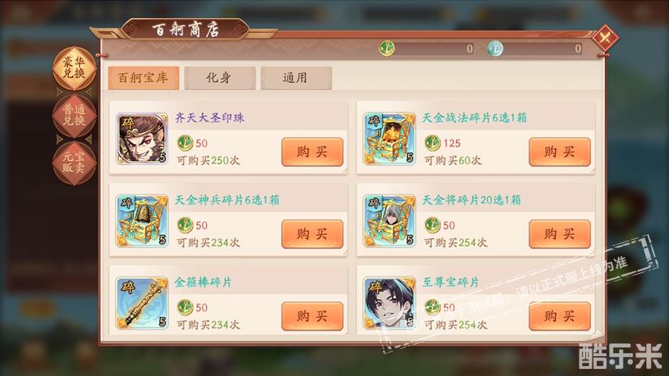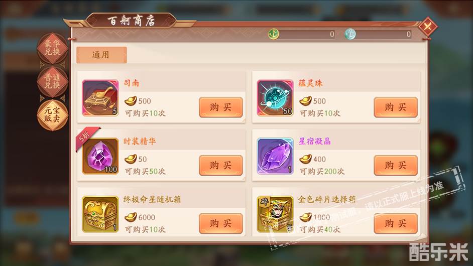 活动期间,少年们消耗元宝可购买一定数量的司南、蕴灵珠、时装精华、星宿凝晶、终极命星随机箱、兵书残卷、幻紫符选择箱、星魂选择箱、金色命星选择箱(20选1)、高级养成资源选择箱、基础养成资源选择箱等丰厚资源,应有尽有,不要错过哟。