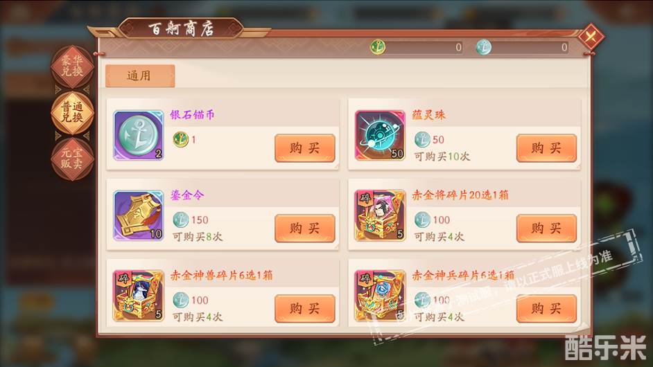 银石锚币可兑换蕴灵珠、鎏金令、赤金将碎片20选1箱、赤金神兽碎片6选1箱、赤金神兵碎片6选1箱、紫金碎片选择箱(六)、紫金装备碎片箱、星宿凝晶、八卦幻紫石、幻紫符选择箱、星魂选择箱、兵书残卷等珍贵道具。