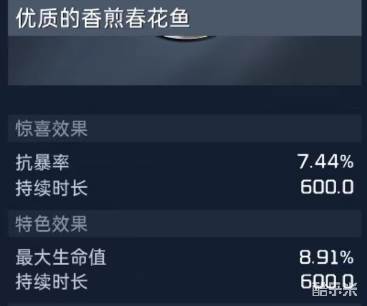 这是一道属于美味佳肴分类的作品,使用之后能够恢复饱食度,饮水度,还有生命值提升效果,如果制作时采用的是高级食材,那么还有概率获得惊喜效果。这些效果是可以同时生效的,所以以吃下去的烹饪品级和获取状态有着很重要关系。就当太太制作的时候,需要的材料也比较多,要有两条春花鱼和两份水才能得到。