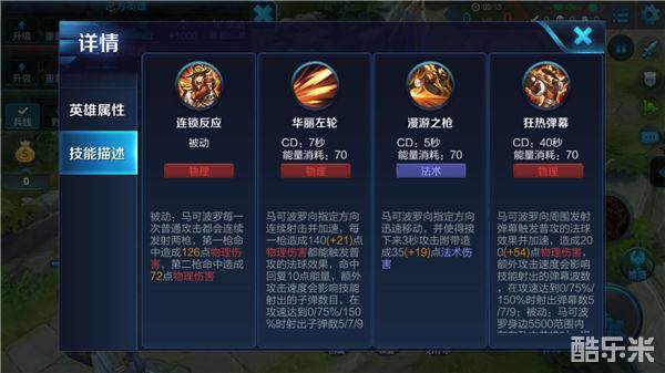 一技能-华丽左轮:马可波罗朝指定方向连续射击并加速,造成物理伤害,并能触发普攻的法球效果,命中目标时,将回复自身能量,额外的攻击速度加成,将影响马可波罗射出的子弹数目,攻速越高,子弹越多。