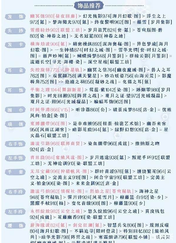 6.袜套:轻挽花葶3585[氟]>枯骨-入夜3180[魑魅魍魉」>流沙若金31401星:雨祈愿-图]>宇宙尘埃3090[苍穹秘轨]>无形枷锁3085[禁忌卷轴图]>陨星轨迹3055[染-成就]>荒野行路3050[云空之境]=珍珠星斗[苍穹秘轨]>荒原旅途3045[云空之境]>塔罗3040[分解礼盒]