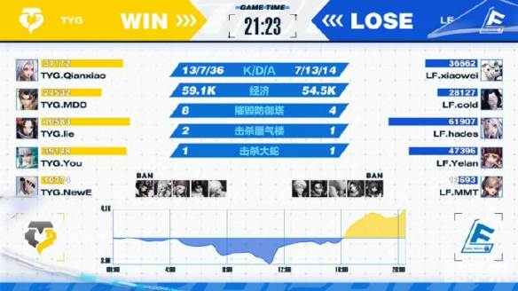 LF率先拿下第一小局,随后TYG在第二小局12分钟左右打出完美团战,以1换5完成翻盘。双方持续拉扯,第四小局TYG再次打出0换4,拉平比分。第五小局TYG终究不敌火力全开的LF,败下阵来。但从整个大场TYG的表现不难看出,队伍整体的配合已经愈发熟稔,团战思维有时能胜过LF,期待TYG在接下来的比赛中继续成长。
