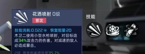 木卫二在外形方面非常简单,就是一个漂浮着的小机器人,虽然形象简单但是技能却有着比较复杂效果。普攻花洒喷射,使用小型水枪喷射攻击,对目标造成伤害以后,如果敌人处于减速状态,则必定触发暴击。通过提升等级达到6级时候,普攻伤害略微提升,暴击伤害提升19%。适合与减速效果一起使用好,在自身接下来的技能就可以造成减速。