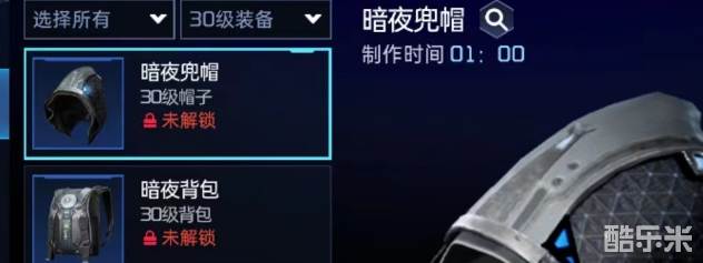 暗夜护指增加攻击和暴击强度,采用全指手套设计,和手指完美贴合,拥有流线型传感材料,需要2份纤维布,4块塑料,5个几丁质外壳,13个二极管,16个电子元件。暗夜长裤以仿生纤维制作,易于行动而且面料带有光泽,膝盖处还进行了加固,增加生命、护盾、防御,需要2份纤维布,4快塑料,5个几丁质外壳,13个精密零件和16个电子元件。暗夜战甲同样是仿生纤维搭配上合金制作,非常有质感光泽,胸部和肩部还有纳米陶瓷进行强化,需要2份纤维布,3块陶瓷,5个几丁质外壳,13个精密零件和16个电子元件。