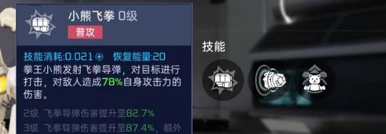 拳王小熊在外观方面非常可爱,是只萌萌小熊驾驶着迷你机甲,该机甲虽然不如人类战甲威猛,但是也能起到很强战斗辅助作用。战斗时拥有三个技能,第1个小熊飞弹,发射出飞拳导弹对目标进行打击,造成伤害和自身攻击力相关。在1级时为78%攻击力数值伤害,后续通过提升等级还能获得额外效果,当达到6级时,不仅导弹伤害提升至101.4%,还拥有额外伤害属性。该技能属于普攻类型,所以在常规输出方面非常给力。