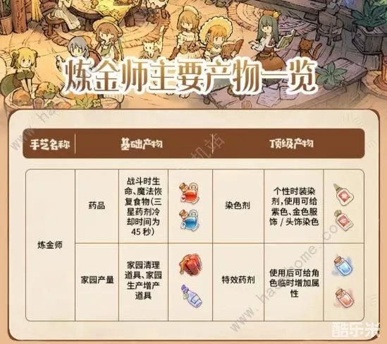 炼金师的主要产物是药品、战力提升特效药剂、家园道具、时装染色剂。