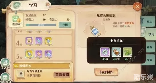 ①炼金师需要多次炼制产物提升手艺等级,并解锁新的产物配方;