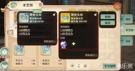 高级的手艺装备不仅可以提高手艺相关的属性:领悟力(提升配方熟练度星级上限、解锁高级配方效果)、专注力(缩短制作耗时)、幸运力(提高采集幸运产出概率)、敏捷力(提高采集速度);其中有些高级的产物需要领悟力达到一定水平后才能解锁!