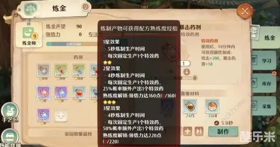 ②重复炼制产物还有概率提升配方熟练度,制作速度、双倍产出概率、产物属性加成会随着产物星级提升而提升;