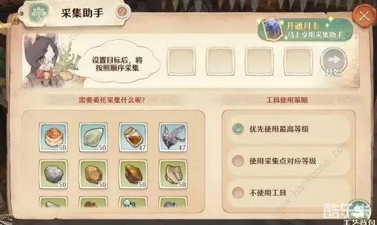 ④购买月卡后会解锁采集助手功能(最多可一次性安排4种材料的自动采集计划!),勇者可以在闲暇时,安排好自动采集计划,直接解放双手!(适度消费,可别贪多哦~)