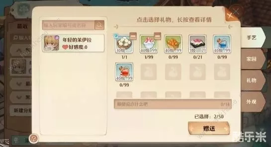 如果觉得以上方式都不够稳妥,就找“手艺搭子”吧!通过【社交-聊天】可以给其他人赠送礼物,可选择的礼物有各个手艺的制作产物、家园产物等(每日赠送无数量限制)。