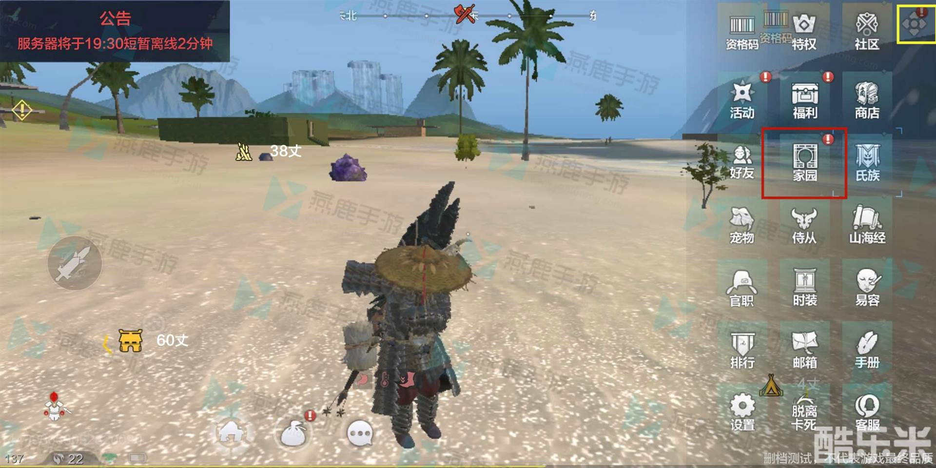 1、先点击游戏右上角的方框,再点击家园按钮;