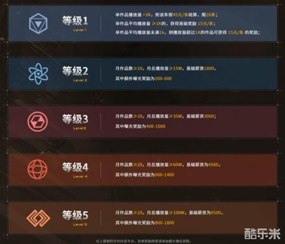 其中,内容创作激励共划分为五个等级。在当期活动结束后,官方会依据创作者在抖音平台上的发布作品数和播放量进行等级评定和奖励发放。满足奖励条件的创作者不仅可获得基础薪资,还有机会拿到令人惊喜的额外曝光奖励。