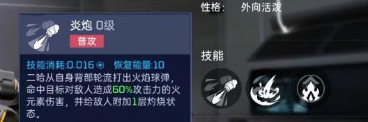 普攻技能炎炮,从自身背部装备轮流打出火焰球弹,命中目标后造成火属性伤害,并且为敌人附加一层灼烧状态。提升等级之后火焰球弹伤害也略有增加,还可以额外造成一次火元素伤害,附加灼烧效果在接下来技能中能起到关键作用。主动技能岩浆,向目标发射岩浆弹,命中之后在其脚下生成半径3.5米岩浆圈,岩浆圈存在5秒钟。每秒都会对圈上敌人造成持续伤害,并且每次伤害都能添加一层灼烧状态。