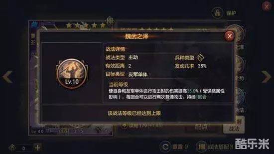 看完属性我们来看看战法。曹丕的战法相当于一个群体性的连战,并且能提升攻击伤害。不过有一点问题在于曹丕如果主加谋略,那么他本来就不高的攻击会更显得贫弱。而如果主加攻击,那么又会让他提供的加成数值少的可怜。但不考虑曹丕属性问题的话,这个技能对于群吕布来说是一个收益非常高的辅助,能全面提升群吕布的伤害。