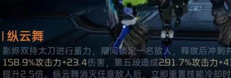 第一个技能追刀斩,挥舞太刀进行最多三次攻击,当前方有敌人时,首次使用技能会触发突刺,向前位移一段距离并且造成伤害。如果集中攻击单个敌人有额外加成,使用追刀斩之后命中怪物将会恢复生命值。第二个技能纵云舞,双持太刀进行蓄力,期间会锁定一名敌人,蓄力结束后释放冲刺并对敌人造成大量伤害,如果目标血量过低有额外加成,每次攻击怪物后都会恢复生命值。