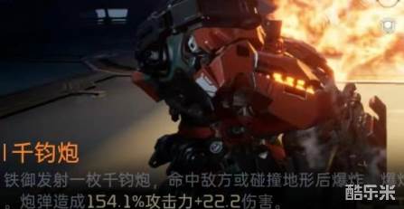 第1个技能千均炮,发射出一枚千均炮,当命中敌方目标或者是碰撞到地形之后爆炸,造成半径三米范围伤害,攻击间隔为0.8秒,每发射4次后需要停下来换子弹。第2个技能焊地铁拳,启动手臂上推进器猛攻击地面,对4.5米半径范围内敌人造成伤害并且击晕,技能期间能够移动较短距离,通过长按技能按钮方式可标记位置。第3个技能赤红飓风,后背上涡轮机喷出巨大烈火,对范围内敌人造成伤害,烈火不能穿透障碍物,技能持续期间无法射击,但是可以挥舞手部打击敌人。