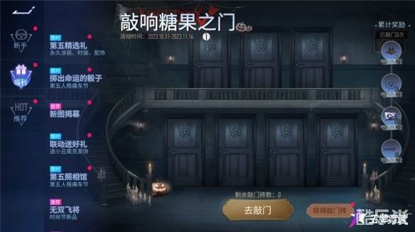 即日起至11月16日,通过登录、点赞、消耗金币等获取活动道具“敲门砖”,敲响糖果之门,门后随机隐藏着监管者或求生者,如果出现的是求生者,车手将获得内含诱人奖励的第五糖果包。如果出现的是监管者,便需要进入激烈的对局,胜利后可获取第五糖果包,失败则会被关入南瓜笼子,30分钟内不可再次敲门。