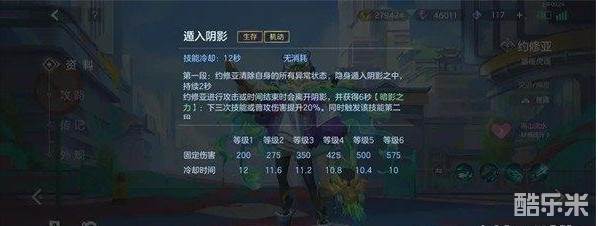 第一段:约修亚清除自身的所有异常状态,隐身遁入阴影之中持续2秒约修亚进行攻击或时间结束时会离开阴影,并获得6秒【暗影之力】:下三次技能或普攻伤害提升20%。同时触发该技能第二段第二段:瞬移到选定位置并向附近的敌人释放一团【灵魂之火】,造成200(+75/lv)(+45%物攻加成)点法术伤害