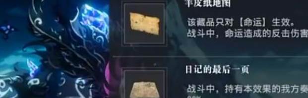 1、核心藏品:羊皮纸地图,效果是提高命运反击伤害100%,这个感觉非常关键,别的都好说,没这个你可能连最终Boss都未必能见到