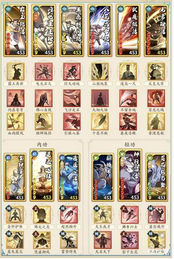 这一套的搭配,核心在于将伤害前置,尽早把伤害输出。要做到稳定输出,关键是在于让[霸王枪法]招式[霸王在世]的暴击增伤和[闪电五连鞭]的[电光石火]+[问鼎苍穹]的连击加成,有稳定的环境来输出。