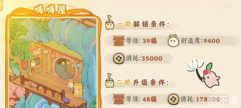 嗨嗨屋位于茶茶阁的下方,一阶解锁[块块嗨嗨]小游戏,[块块嗨嗨]游戏结束时会根据得分获得不同数量的福禄币,计入福禄币周获取上限,达到上限后不再能获得福禄币。升级二阶可以增加270舒适度。